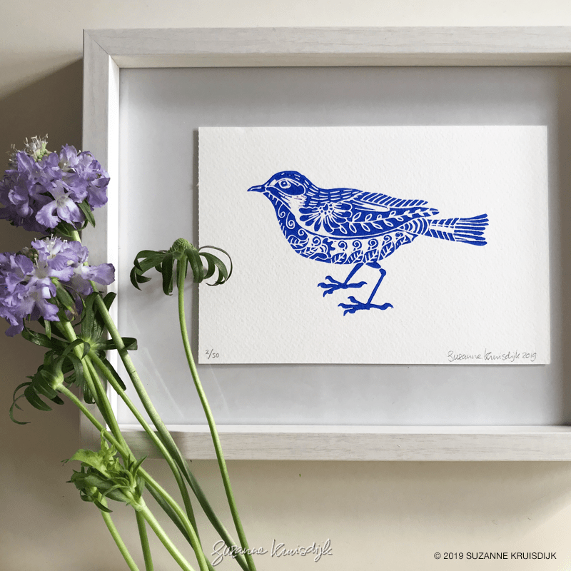 I have drawn this bird by hand, designed it and cut it in lino. Each print is individually inked and printed on paper and therefore unique. It is a limited edition print with a circulation of 50 at this size! Each print is numbered and signed by hand. The color blue can be compared to pantone reflex blue.