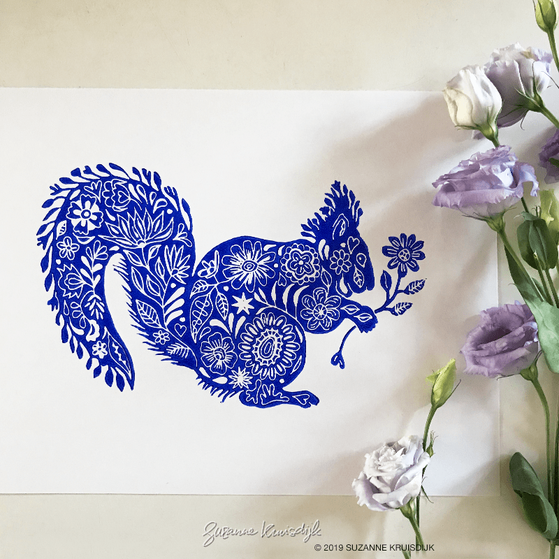 The design for this lino originated from my love for nature and patterns. Animals and flowers come together beautifully in this design. The color blue can be compared to pantone reflex blue.
