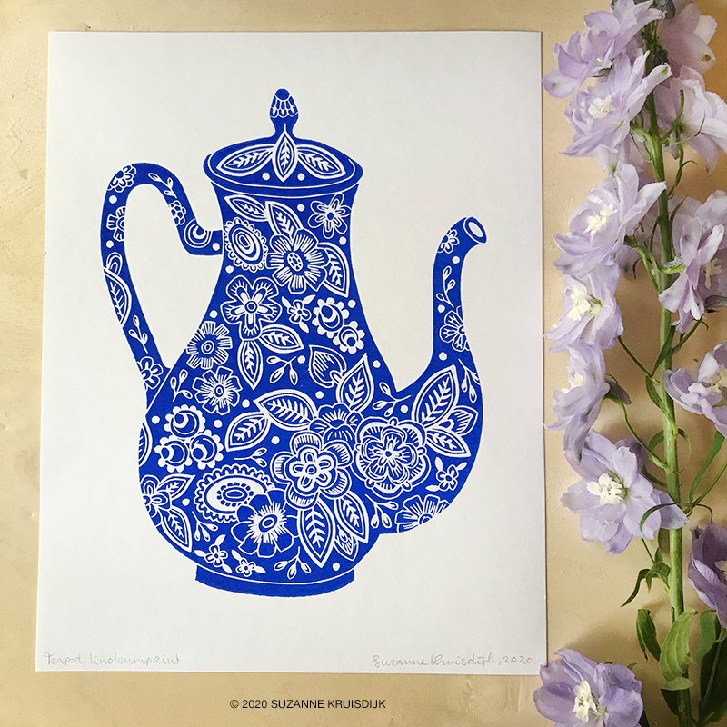 The design for this linoleum piece is inspired by the tableware my grandmother had when I was a little child. I really loved the floral pattern of the Beatrix pottery from Maastricht. I decided to make an open print run with three colour versions: ultramarine blue, dark blue and old pink.