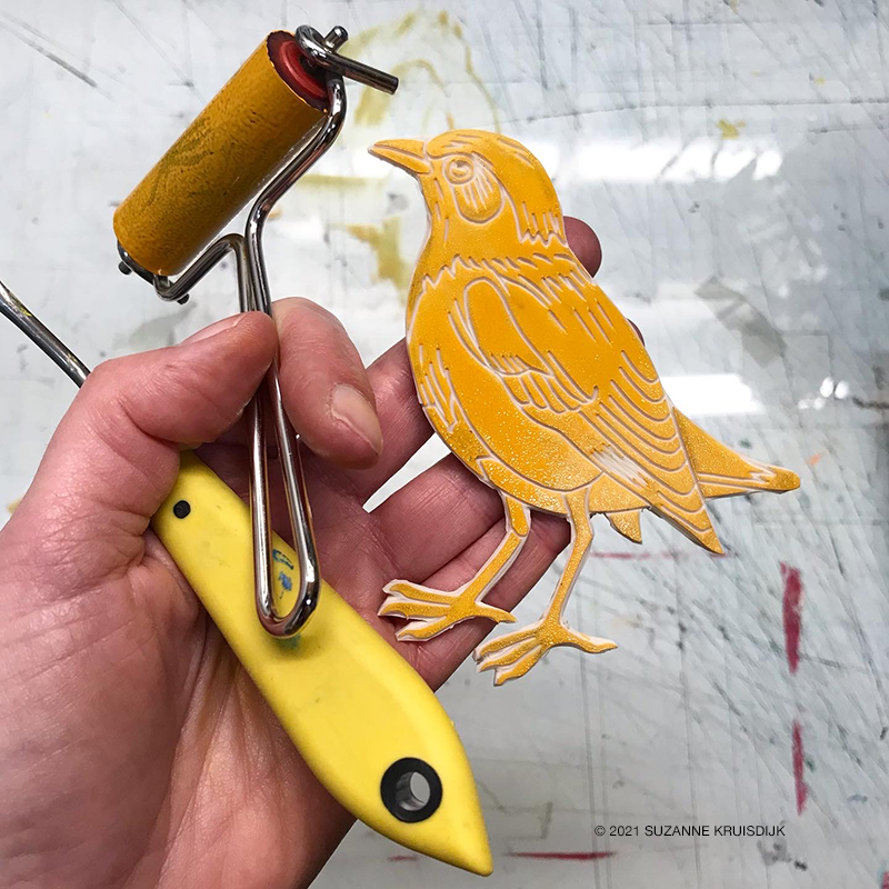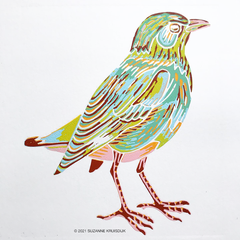 I started making this bird being curious if I could do a multi colour piece on this small suface. It was quite a challenge, but a fun one! As well with the color scheme I stepped out of my ‘comfort zone’. Six colour layers have been printed for this bird, made with both linoleum reduction and puzzle technique. It is a limited edition print with a circulation of 21. Each print is numbered and signed by hand.