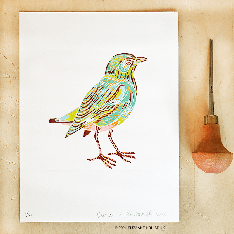 I started making this bird being curious if I could do a multi colour piece on this small suface. It was quite a challenge, but a fun one! As well with the color scheme I stepped out of my ‘comfort zone’. Six colour layers have been printed for this bird, made with both linoleum reduction and puzzle technique. It is a limited edition print with a circulation of 21. Each print is numbered and signed by hand.