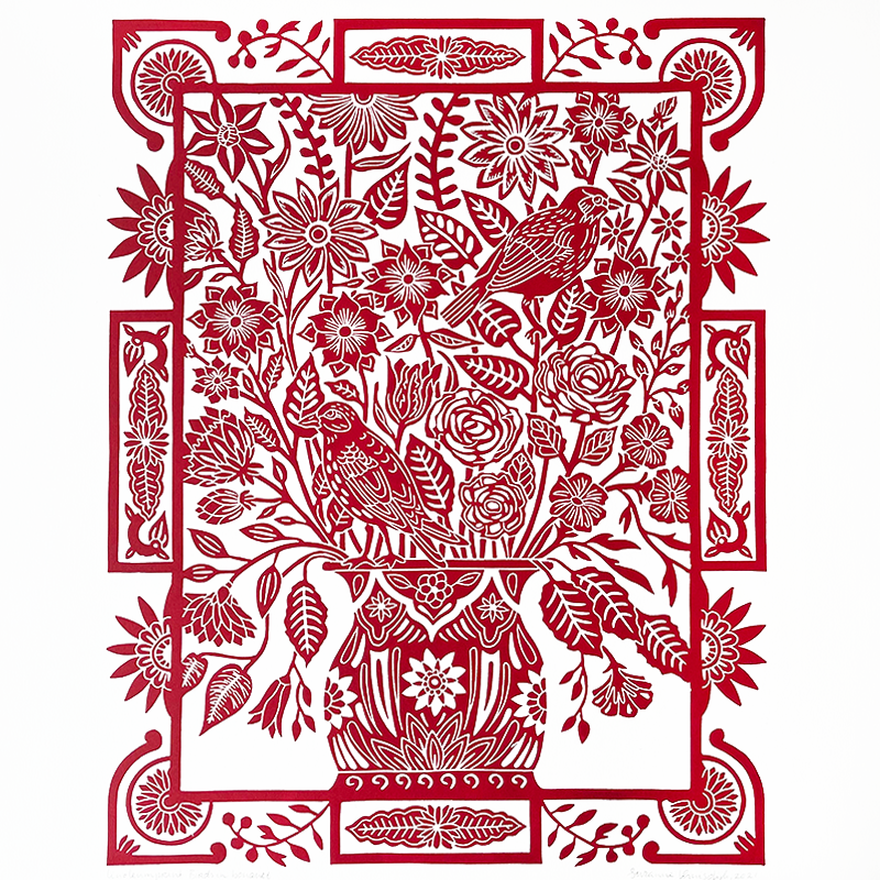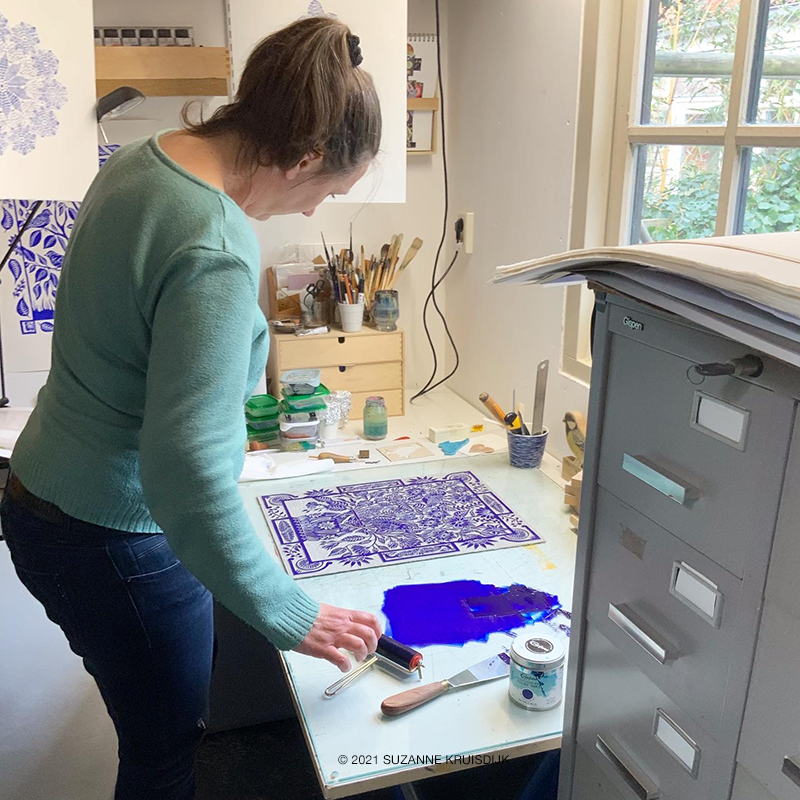 This new XL linoleum piece is matching the theme and size of the two XL linoleum pieces I made last year, as part of a series. It’s the most detailed one thus far and really challenging to carve. I’ve made a print run in three colours: phthalo blue, ultramarine blue and process red.