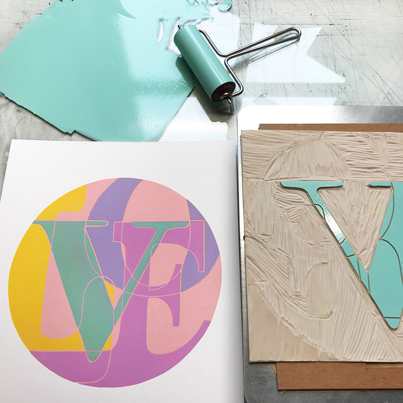 I have drawn this text by hand, designed it and cut it in lino. For each print layer there has been more linoleum carved away from the block. It is a reduction linoleum print with 5 colour layers: soft pink, yellow, lavender blue, soft green and magenta. Each print is signed by hand.