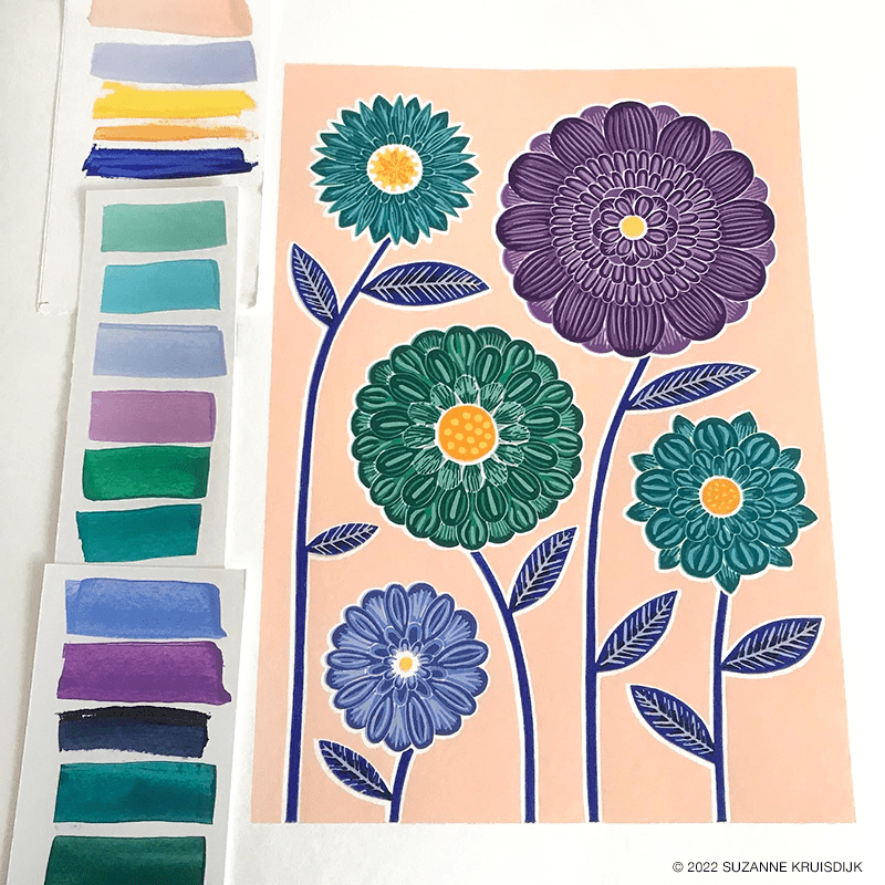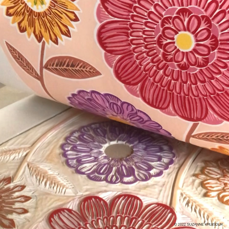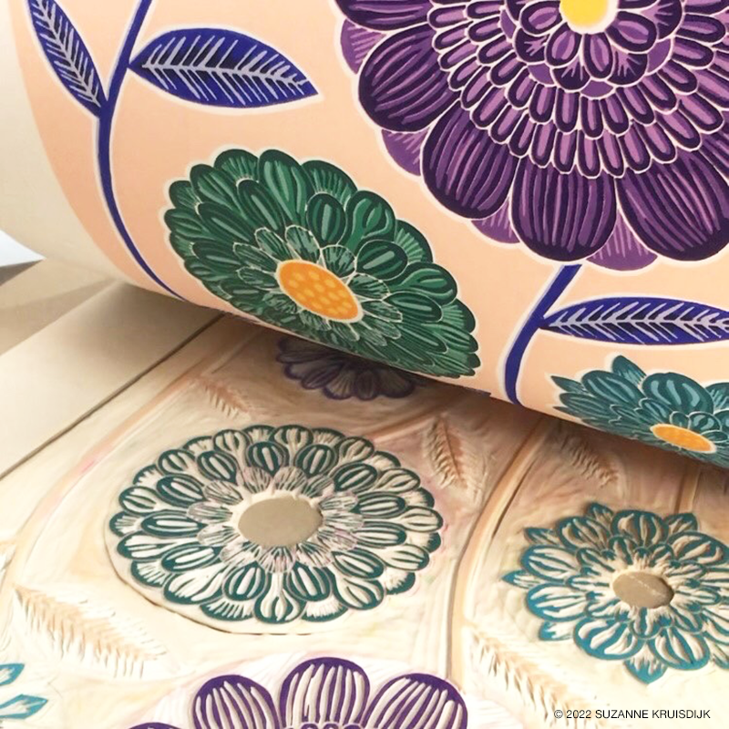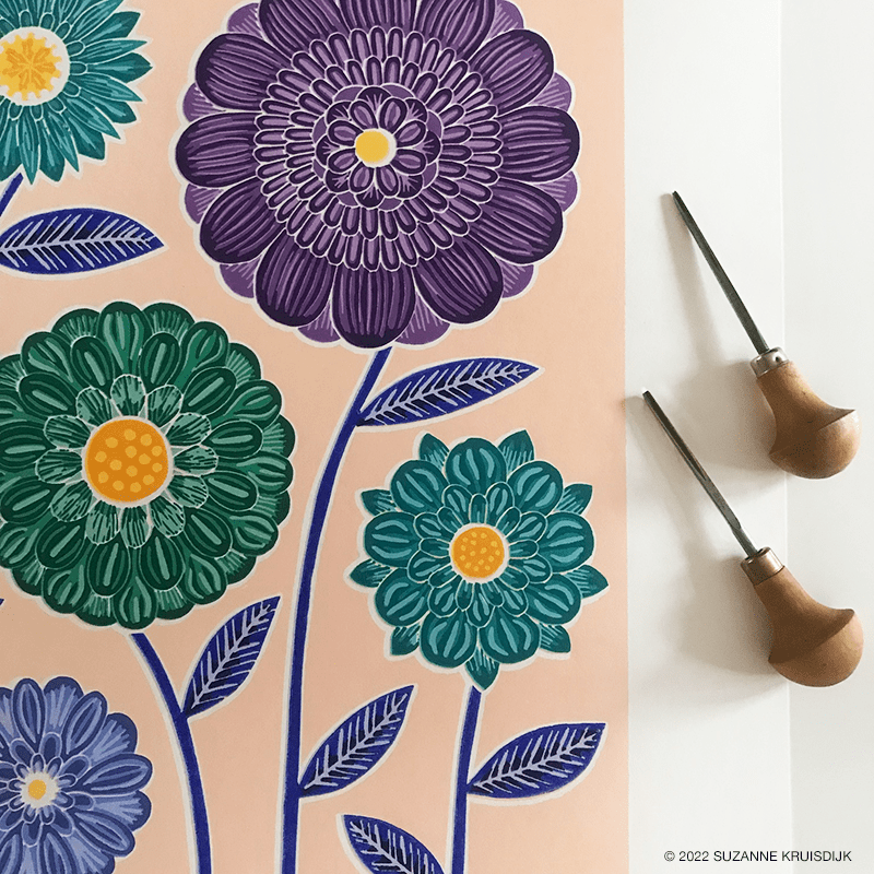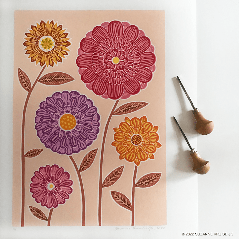 These limited edition linoleum prints are available in 2 color schemes. There is a blue/green and a red/pink version. They are made with a combination of reduction and puzzle technique. Many colors are used in this print, a total of 18 (!) different colours are printed layer upon layer. Each print is individually inked and printed on paper and therefore unique. These limited edition prints with a circulation of only 8 red/pink and 4 blue green prints are original handmade and numbered and signed by hand.