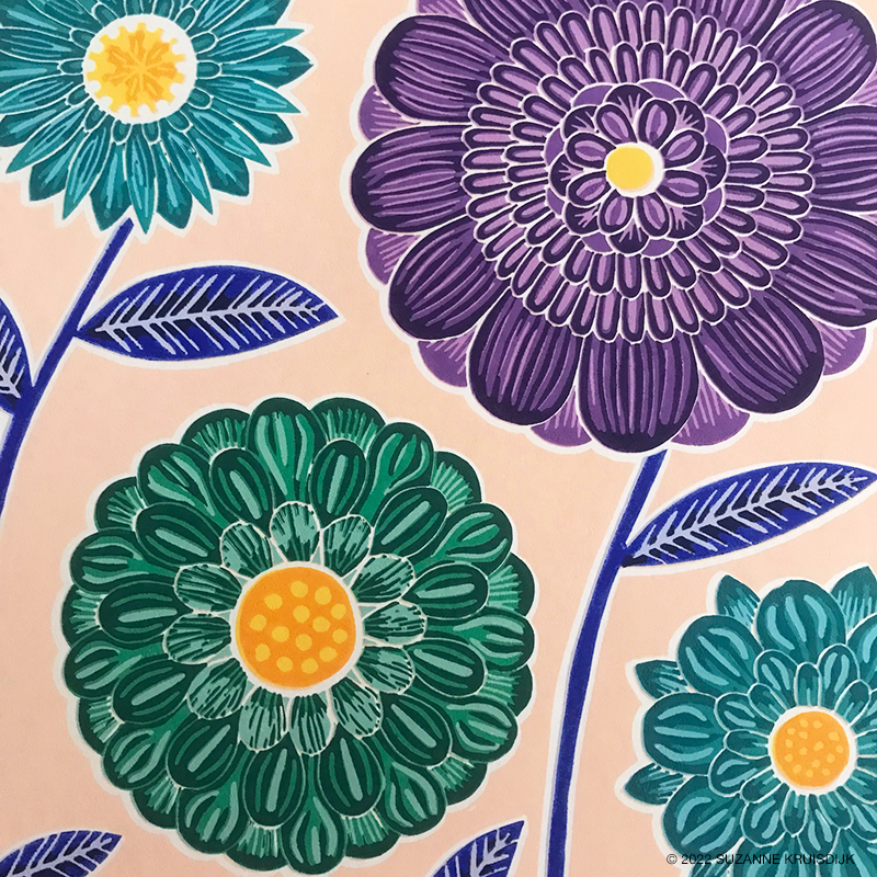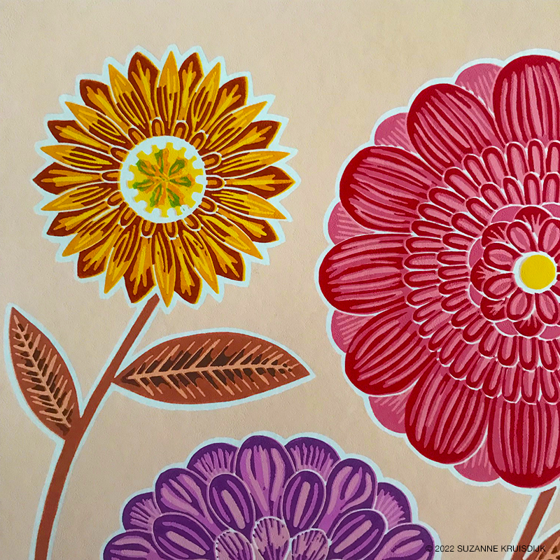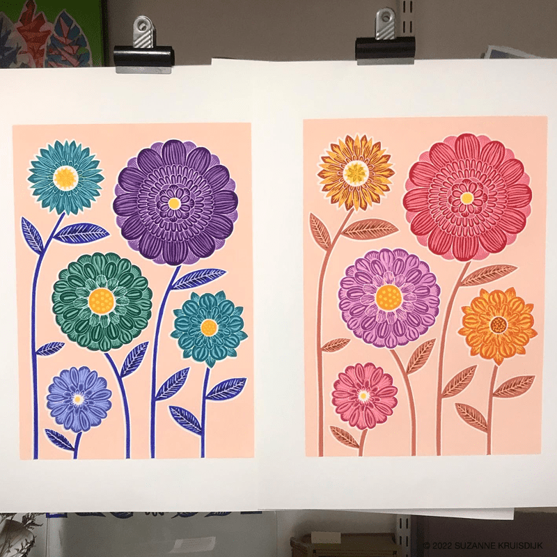 These limited edition linoleum prints are available in 2 color schemes. There is a blue/green and a red/pink version. They are made with a combination of reduction and puzzle technique. Many colors are used in this print, a total of 18 (!) different colours are printed layer upon layer. Each print is individually inked and printed on paper and therefore unique. These limited edition prints with a circulation of only 8 red/pink and 4 blue green prints are original handmade and numbered and signed by hand.