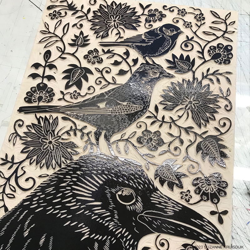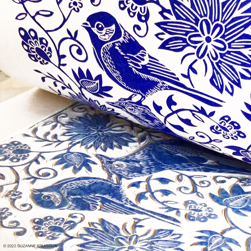 First new linoleum pint of the new year! This A3 size birds and and flowers linoleum block was quite a challenge to carve. Printed in ultramarine and black.