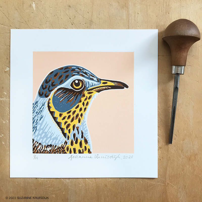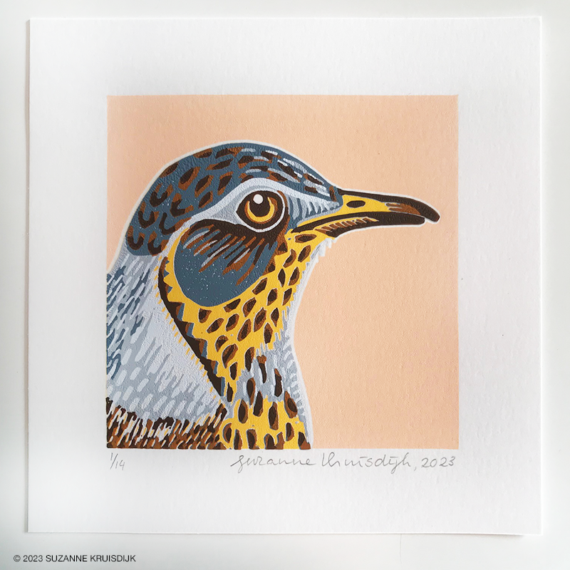 This fieldfare bird portrait is a reduction linoleum print with 7 colour layers: salmon, yellow, three shades of blue and two shades of brown. It is a limited edition print with a circulation of only 14!