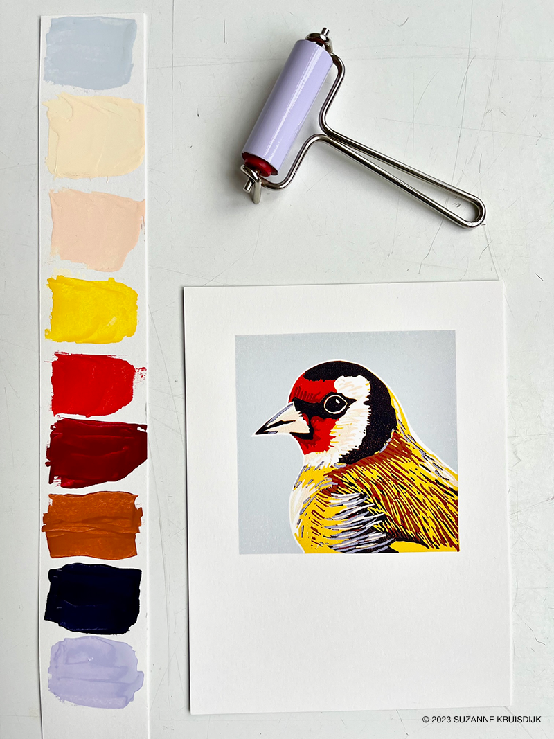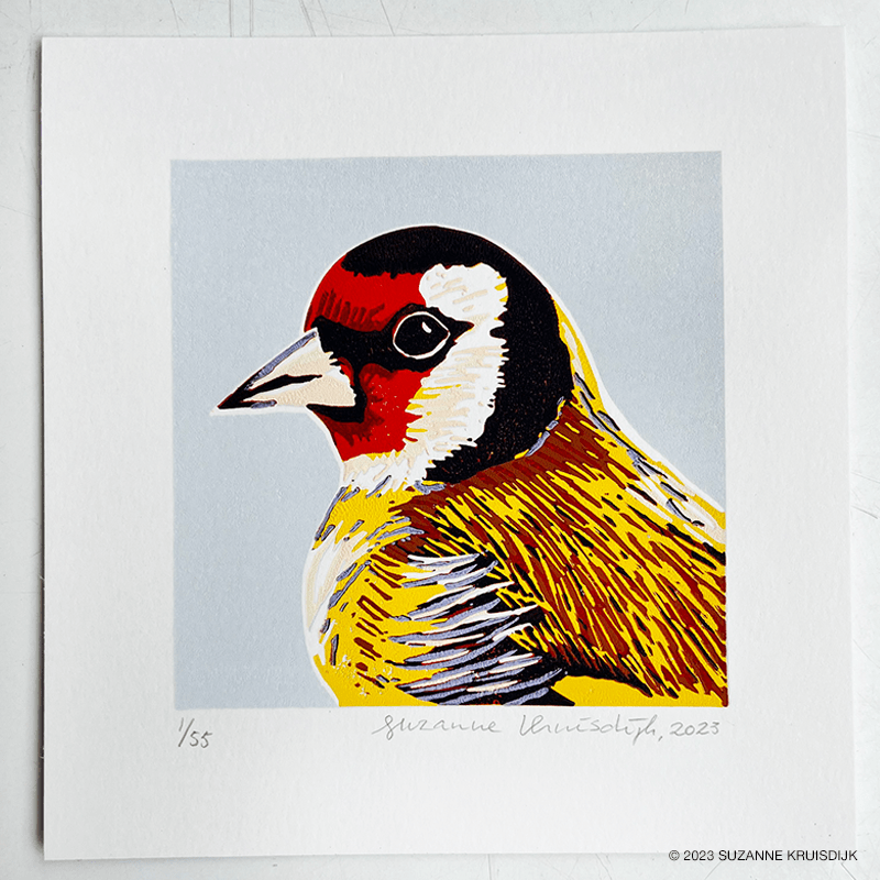 A new bird portrait finished! Another reduction linoleum print with 9 (!) color layers. It is the 5th of a series of bird portraits I am currently working on. This portrait is inspired by the Goldfinch which I regularly encountered in the past when I went for a walk with my horse. To make the plumage of the body lively, different tones were needed that are closer together in terms of color scheme. For each layer of color I cut away more linoleum from one and the same block. As a result, the linoleum block in the last layer is reduced to almost nothing and is no longer suitable for reprinting. It is a limited edition of 55 prints. I have done my very best to print a high edition, but with the amount of colour layers this really seems to be the maximum achievable…
