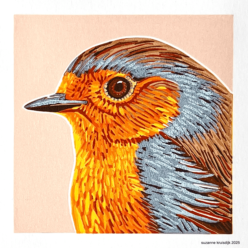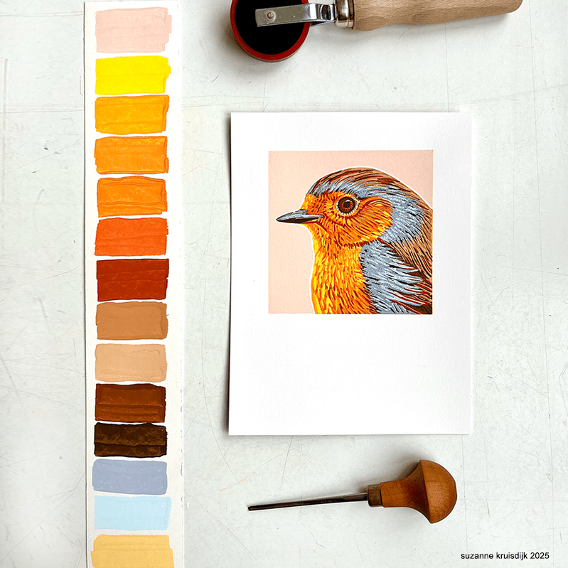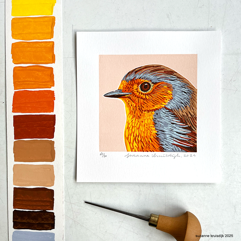 New year, new bird: I’m so excited to show you this finished new linoleum reduction print bird portrait! For this Robin I printed 14 (!) color layers. Happy and proud to add this one to the series of bird portraits. It was definitely the most challenging to make, it took me endless color mixing and testing between layers… It’s a limited edition, for each color layer I cut more linoleum from the same block of linoleum. Each color has to dry for at least 24 hours between printing layers, depending on the weather and color. The weather wasn’t cooperative this time of year: too cold for printing some days and difficult light for photographing and filming.