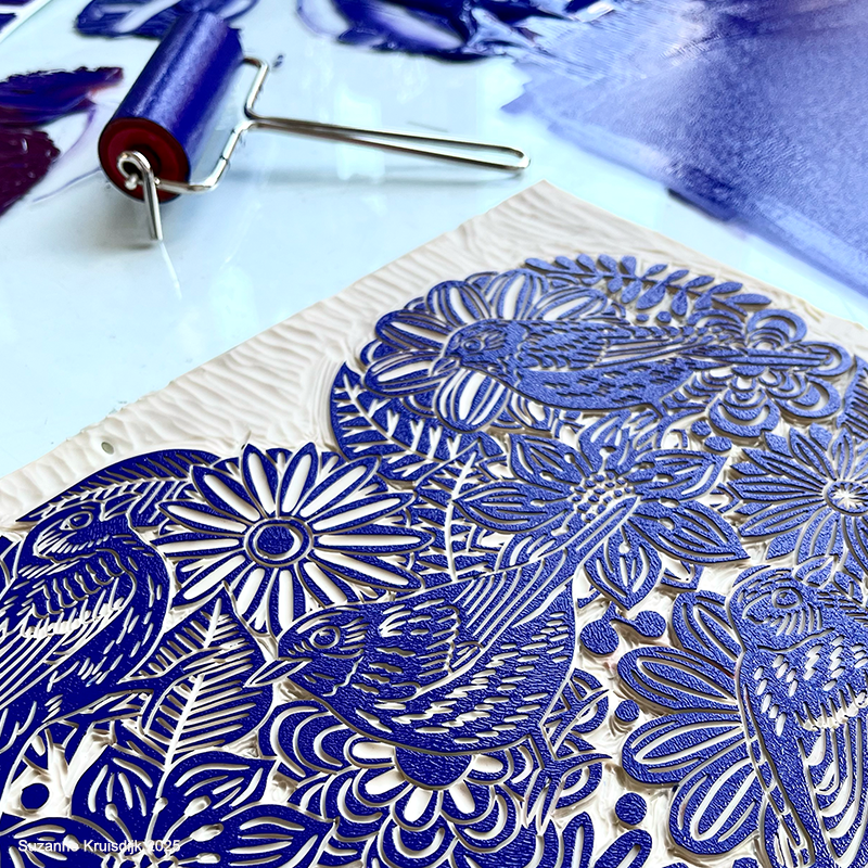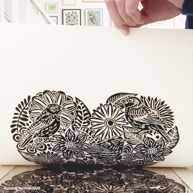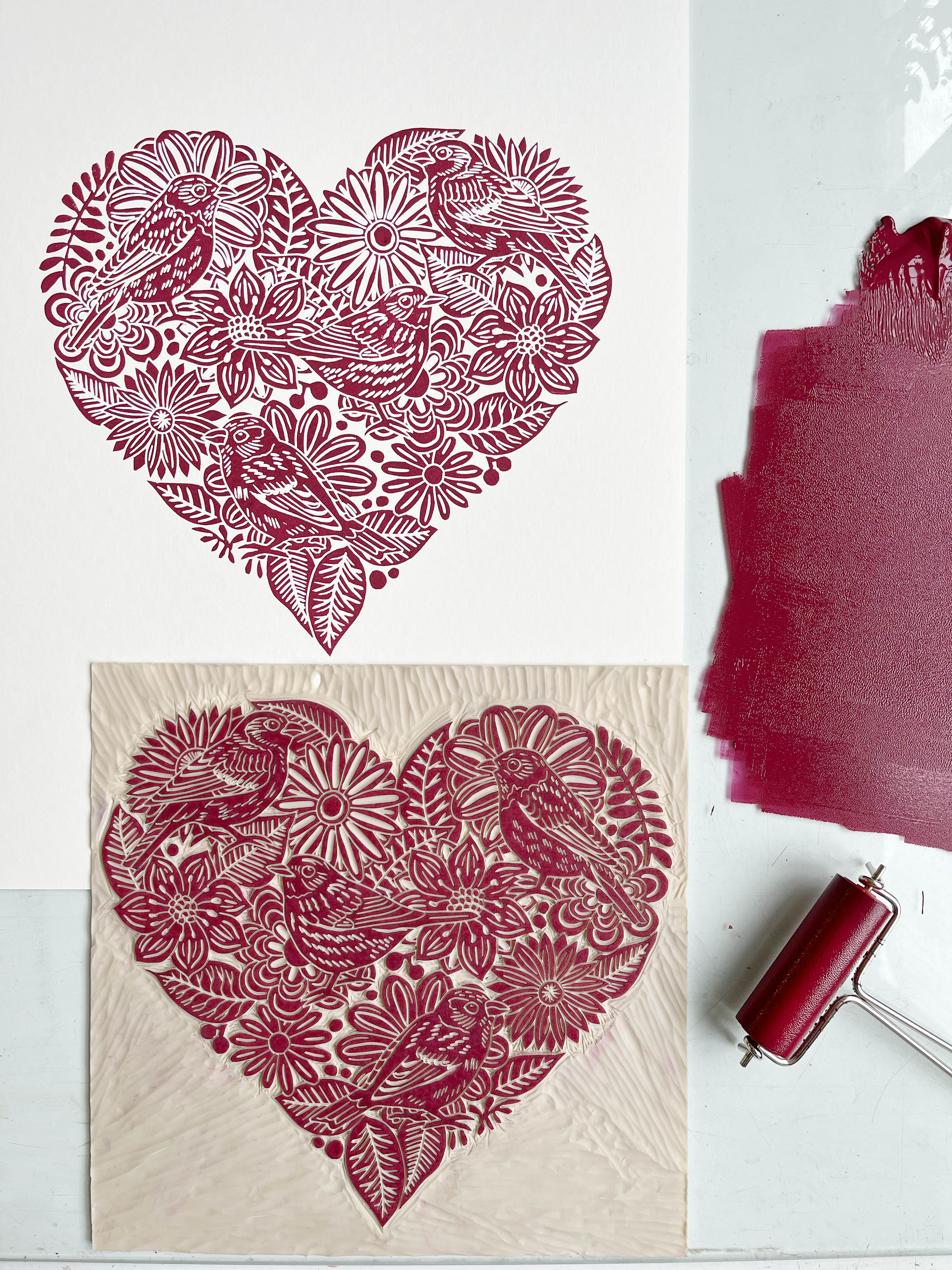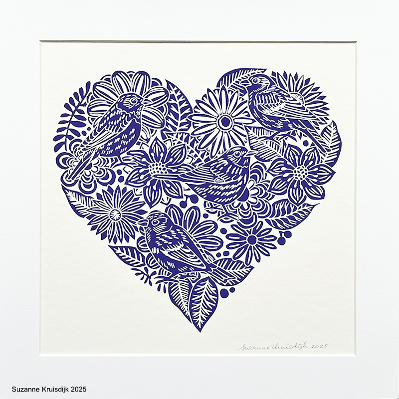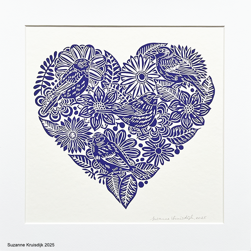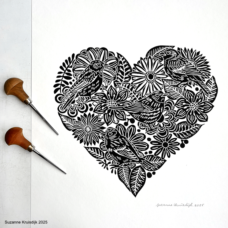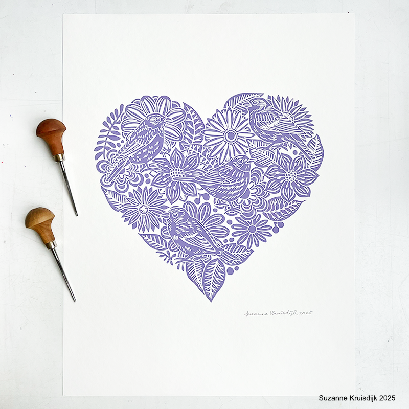 Like every year I made a linoleum print especially for this day and like every year I’m ready at the last minute to launch it on the day itself. Something to do with planning… But then, I think “love is for every day of the year”. There are 4 birds ‘hidden’ between the leaves and flowers in this heart. It is an open edition which I printed in different colors. Not the easiest linoleum block to print due to the detail and shape, but super happy with the result and I hope you like it!