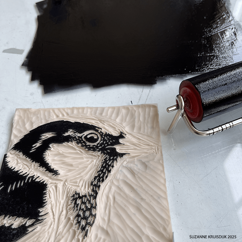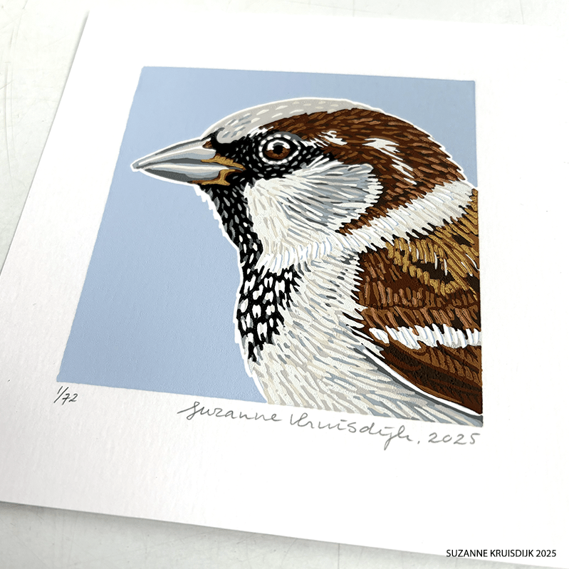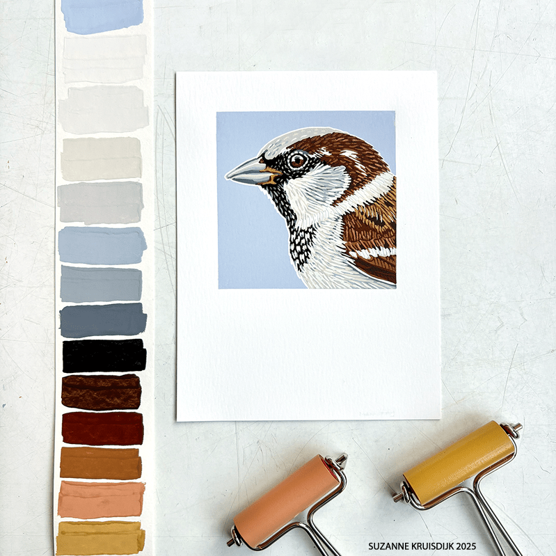Happy and proud to show you this freshly finished reduction linoleum print! It’s the 15th one in my bird portrait series. For this Sparrow I printed 14 (!) colors. Although it is a somewhat sober color palette, and I am a huge color fan myself, I found this color scheme really challenging and interesting to make. To bring out the nuances required a lot of precision and attention. The last two colors I did print simultaneously in one layer. It’s a limited edition print run, for each color layer I carved more linoleum from the same block of linoleum. As a result, the linoleum block is reduced and not suitable anymore for reprinting. Each color has to dry for at least 24 hours between printing layers, depending on the weather and color.