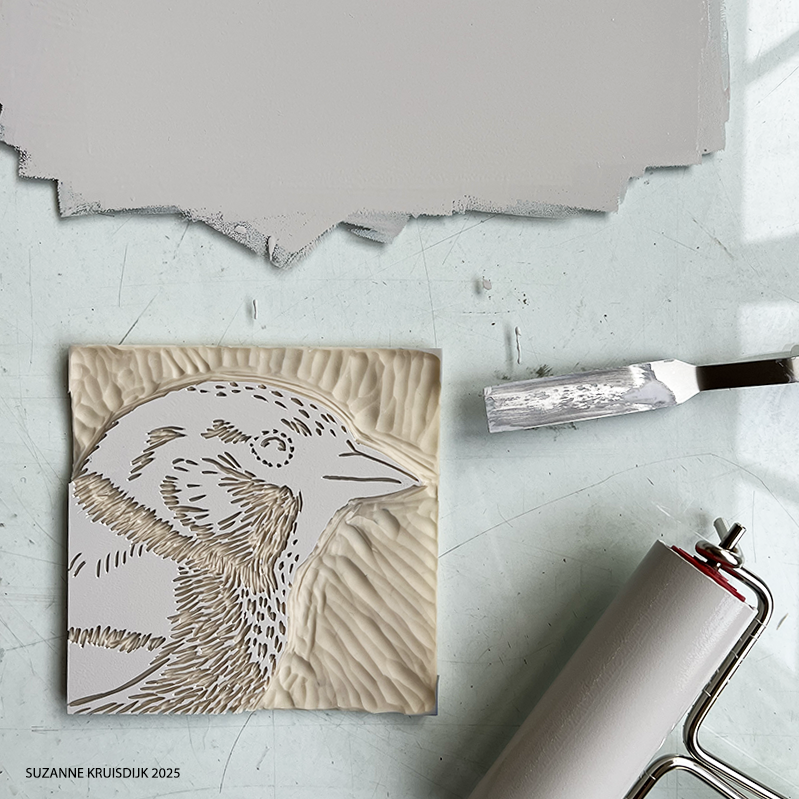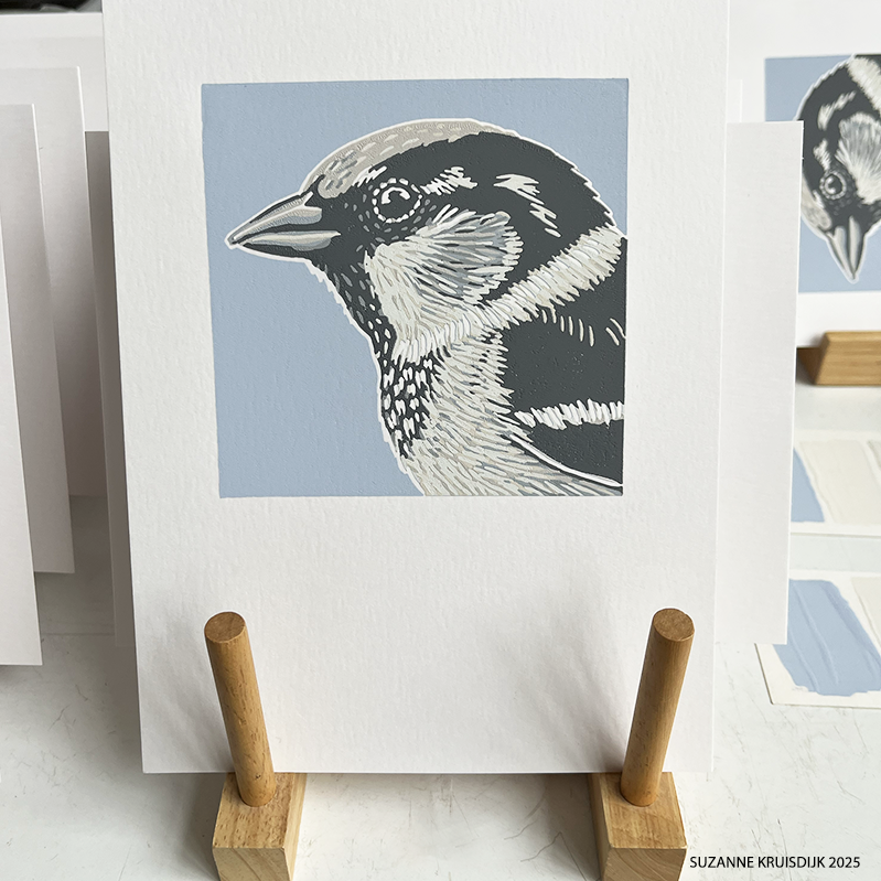 Happy and proud to show you this freshly finished reduction linoleum print! It’s the 15th one in my bird portrait series. For this Sparrow I printed 14 (!) colors. Although it is a somewhat sober color palette, and I am a huge color fan myself, I found this color scheme really challenging and interesting to make. To bring out the nuances required a lot of precision and attention. The last two colors I did print simultaneously in one layer. It’s a limited edition print run, for each color layer I carved more linoleum from the same block of linoleum. As a result, the linoleum block is reduced and not suitable anymore for reprinting. Each color has to dry for at least 24 hours between printing layers, depending on the weather and color.
