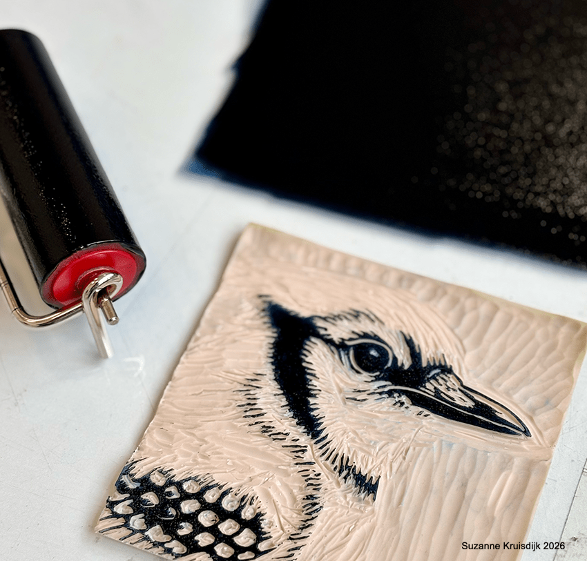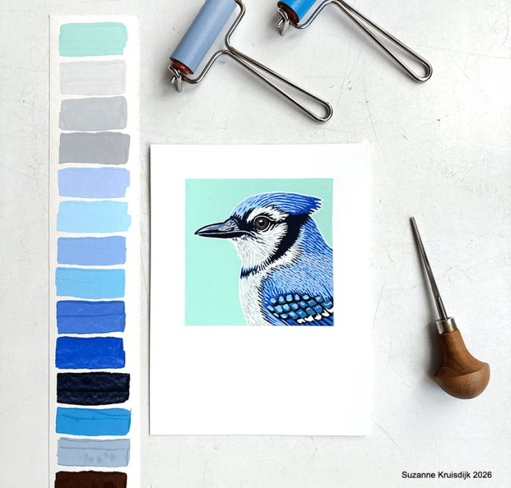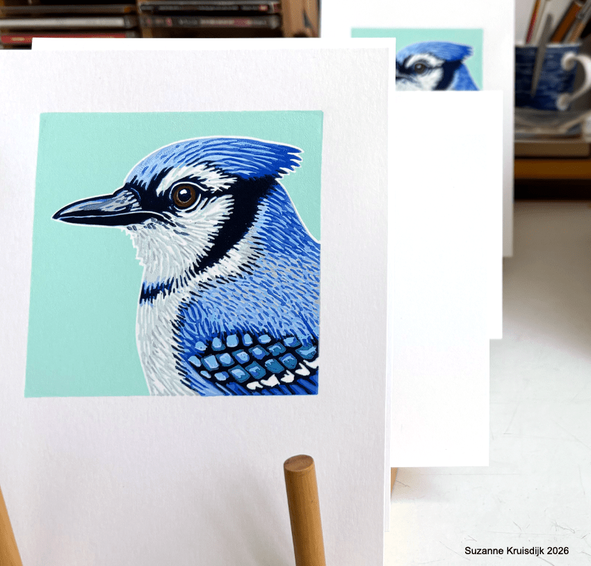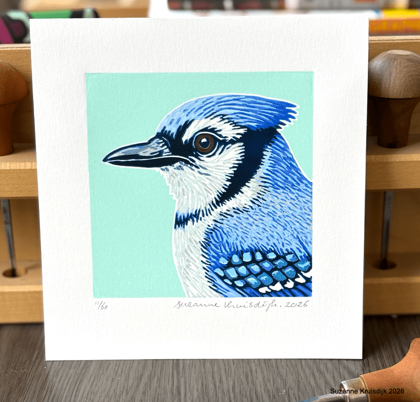 Here’s the finished new linoleum print, the 19th addition to my bird portraits series. This portrait is inspired by the Blue jay. It’s a reduction linoleum print with 14 colour layers. And I just love the colour palette of this one, I’m a true fan of blue. I printed the last 3 colors simultaneously, which was kinda nerve-wracking as there was so little linoleum left on the plate that it took super focus inking and printing. I do mix all colors myself and I always make a lot of color tests to match the combinations of colors together and make all the blue shades blend nicely into each other for the feathers.