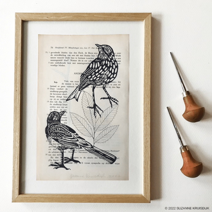 These 2 linoleum cut birds are printed on vintage paper with black ink. The paper is a page from a vintage book, a textbook of botany. This makes every print very unique piece since all book pages are completely different! All prints are signed by hand. DETAILS– Printed on vintage paper– Paper size 13,5 x…