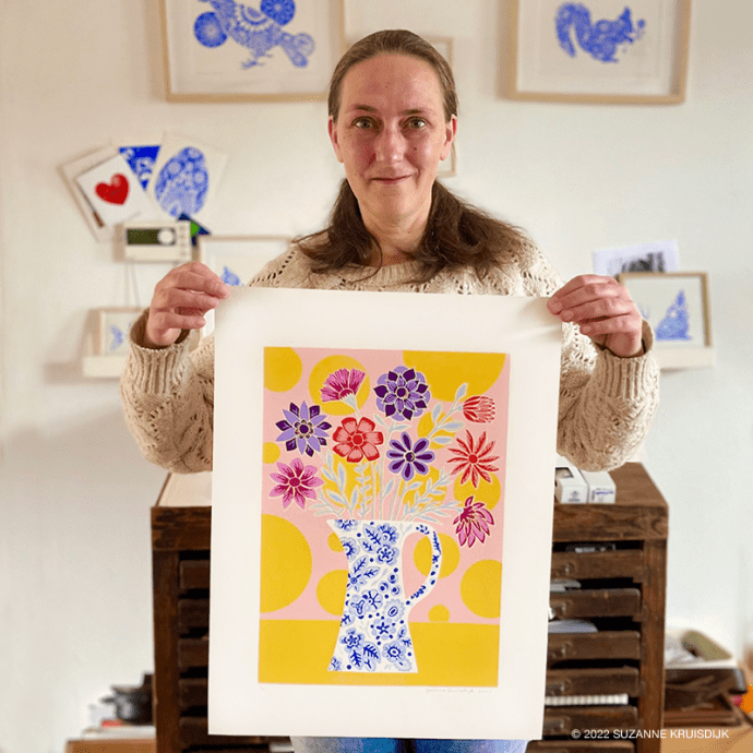 The design for this lino originated from my love for flowers and blue/white ceramics. There are 13 colours printed. I used a combination of reduction and puzzle linoleum techniques. It is a limited edition print with a circulation of only 12 (!) prints, original handmade and numbered and signed by hand. DETAILS Printed on Hahnemühle…