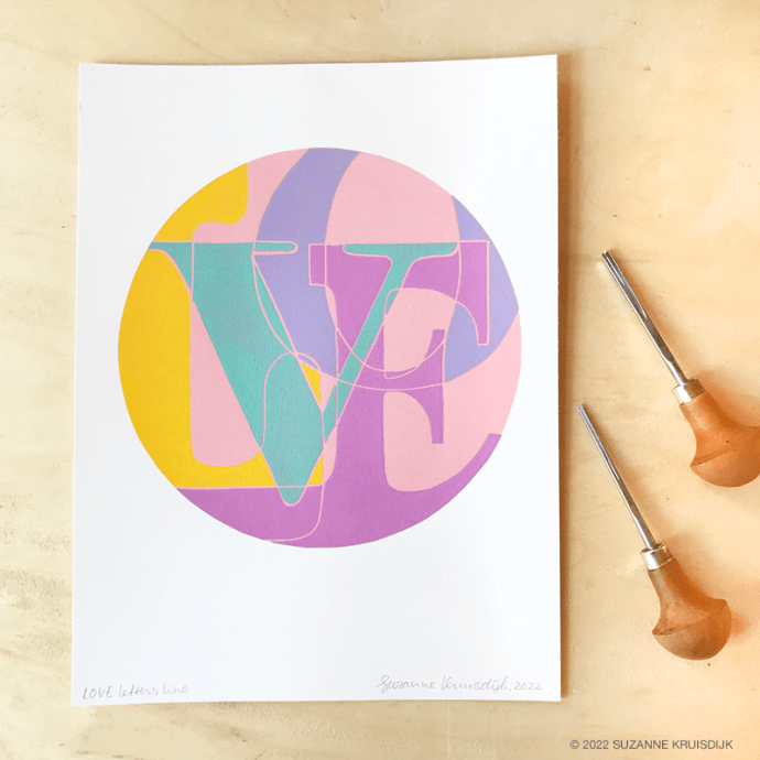 I have drawn this text by hand, designed it and cut it in lino. For each print layer there has been more linoleum carved away from the block. It is a reduction linoleum print with 5 colour layers: soft pink, yellow, lavender blue, soft green and magenta. Each print is signed by hand. DETAILS Printed…