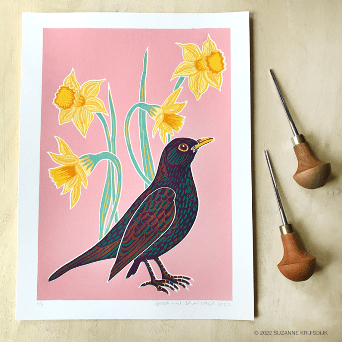 It were the blackbird and daffodils in our garden this spring which inspired me to make this reduction linoleum print. There are 9 colour layers printed individually and 2 variations; a minty green and a pink version. This is a limited edition print with a circulation of only 7 (pink) and 12 (minty green) prints!…