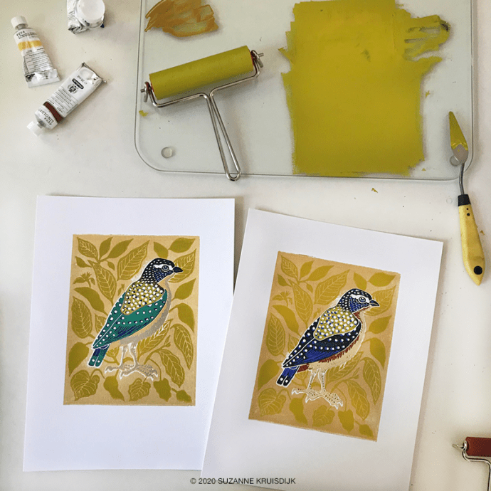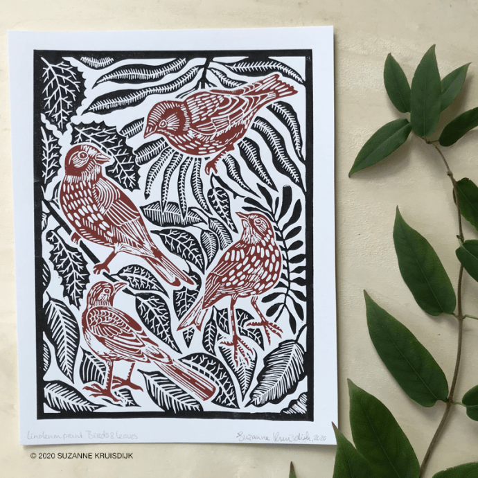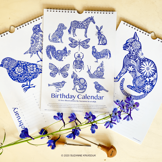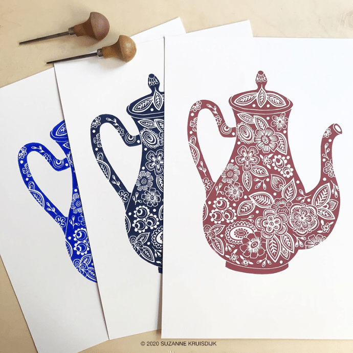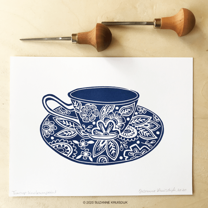 A teacup linoleum piece to join the recently made teapot lino. They are both inspired by Beatrix pottery my grandmother had when I was little. I printed an open run from this piece with three colour versions: ultramarine blue, dark blue and old pink. DETAILS– Printed on Strathmore paper, ‘natural white’, 184 lb.– Paper size…